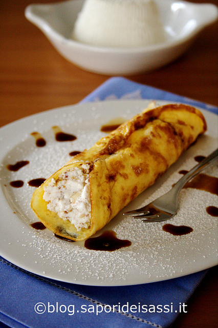 Mettete un paio di cucchiai di composto di ricotta al centro di ogni frittatina e avvolgete per formare i cannelloni.  Spolverate con dello zuccero a velo e decorate con del vincotto originale.