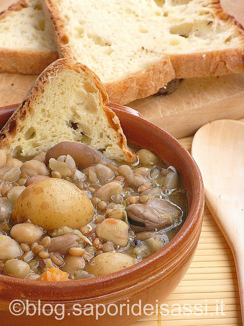 Si tratta di una ricetta secolare, legata alla tradizione contadina materana e alla terra.  E’ una ricetta che rispecchia l’amore che i contadini materani nutrivano nei confronti della propria terra e che racconta le abitudini del “vicinato”, una realtà che, purtroppo, noi giovani non abbiamo mai vissuto.  Il 1°agosto, infatti, si festeggiava la fine del raccolto e, per celebrare l’abbondanza dell’annata, tutte le donne del vicinato portavano una manciata di grano e di legumi, vera ricchezza delle famiglie materane di poco più di mezzo secolo fà.  Tutti i legumi, poi, venivano cotti in un grande pentolone e venivano poi serviti a tutti gli abitanti del vicinato.  Era un’occasione molto attesa e sentita anche perché la zuppa di legumi era accompagnata da dell’ottimo vino rosso.