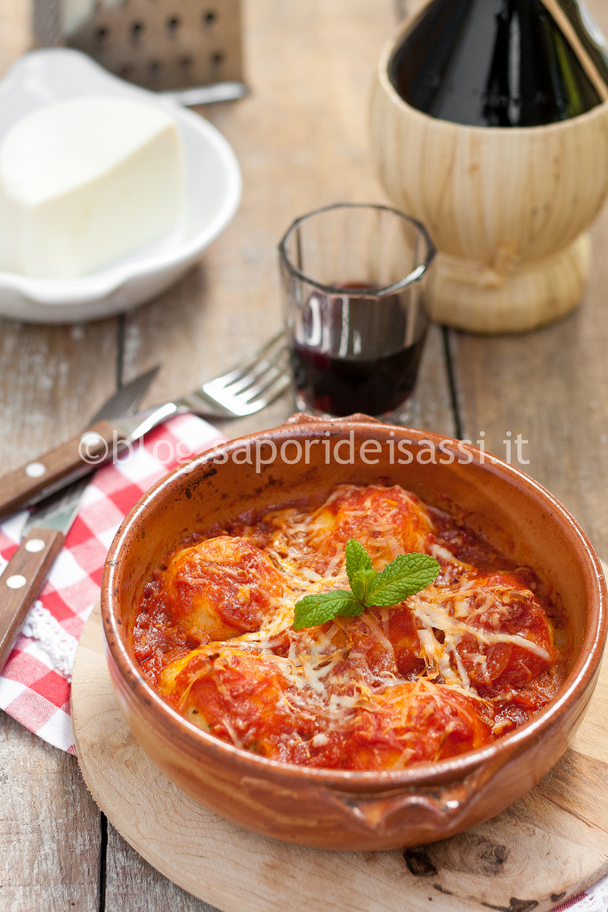 Prendete dei tegamini o una teglia di ceramica da forno e versate nel fondo una parte del sugo che avete preparato. Formate delle polpettine con l’impasto di patate della grandezza di una noce o poco più e disponetele nella teglia, un po’ distanziate l’una dall’altra.