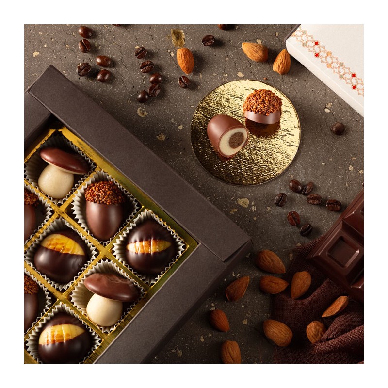 La Pasta di Mandorla Pugliese si veste d’autunno. Castagne rifinite con cioccolato fondente, Funghetti con cioccolato al latte e le Ghiande farcite con Pasta di Mandorla al caffè, ricoperte con finissimo cioccolato al latte e cristalli di zucchero al caffè.