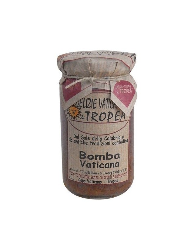 La Bomba Vaticana è un prodotto tipico calabrese a base di Cipolla Rossa di Tropea IGP. E' una conserva naturale, senza coloranti né conservanti, frutto del sole della Calabria e delle antiche tradizioni contadine. Eccellente su pane e bruschette, come condimento nei sughi e per accompagnare carni rosse.