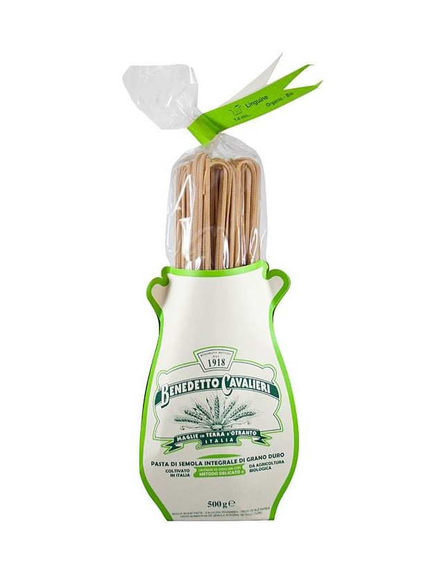 Linguine integrali biologiche del pastificio pugliese Benedetto Cavalieri realizzate con una miscela delle migliori semole integrali di grano duro coltivate in Puglia e Basilicata. La pasta esattamente come nella linea classica, viene prodotta utilizzando il metodo "delicato" che sin dall'impasto della semla con l'acqua, caratterizza ogni fase produttiva sino al confezionamento tutelando le qualità organolettiche del grano con una lavorazione senza forzature e stress per le materie prime.